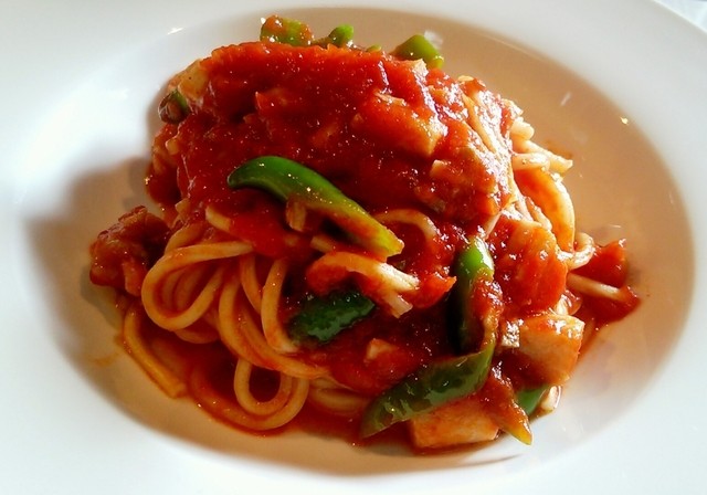 メイン料理(太刀魚と万願寺唐辛子のトマトソースパスタ)