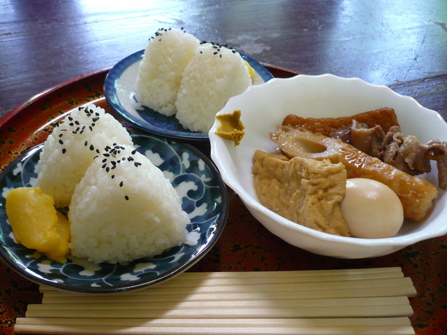 散策のあとで頂く手作りおでんとおにぎり。