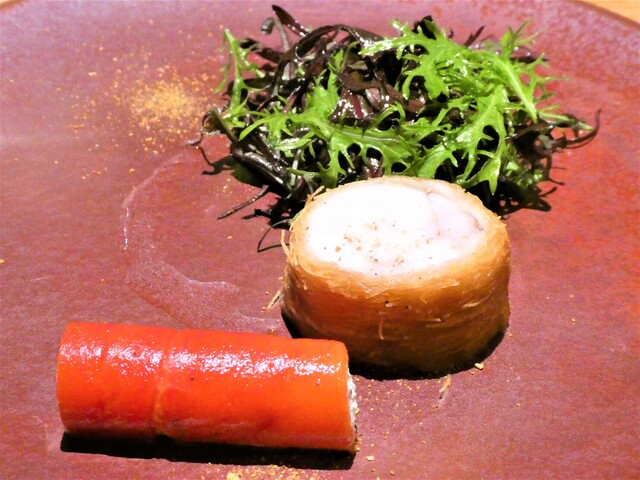 ⑤温前菜Ⅱ(北海道産アンコウのカダイフ巻き リコッタチーズと赤パプリカ サラダ)