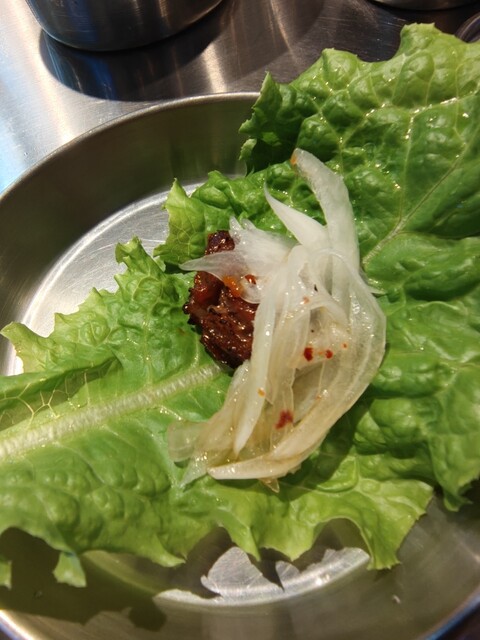 カルメギサル。始めてのお味。そのままでも美味しく タレにつけたり 玉ねぎスライスをサンチュで巻いて 美味しく頂いたりと。 いろいろ楽しみました。