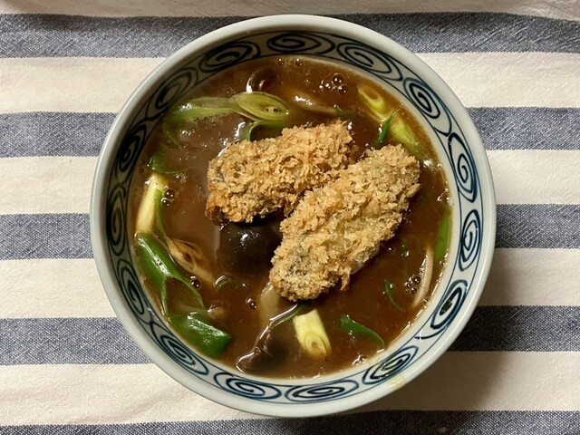 食べ残りで、かきフライカレー南蛮。丼が小さいんではなく、かきフライがおっきいのん。