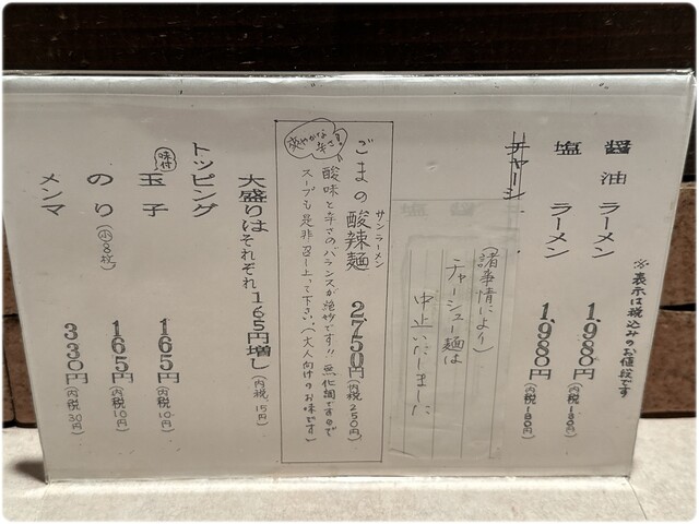 ”食材供給が不安定になっているため、しばらくの間(全く未定)チャーシュー麺はありません”