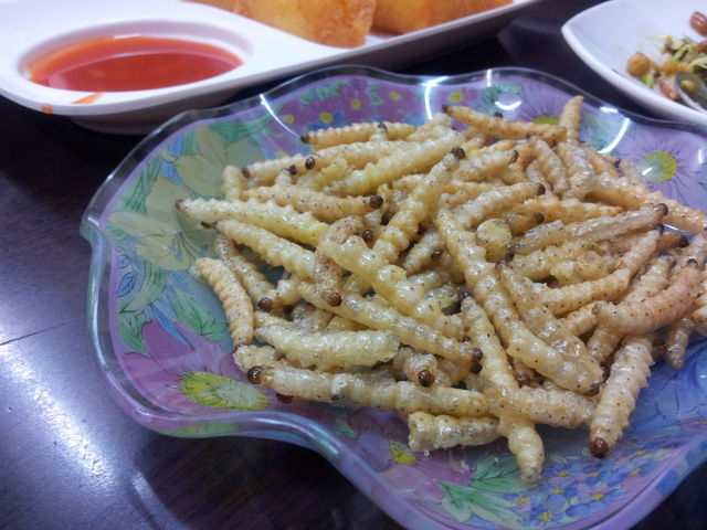 竹の中にいる虫。それが竹蟲。見た目はまごうことなき虫。それを油で揚げたものです。目とか口とかわからないし羽根もないので、イナゴなんかよりは抵抗無く食べられると思いました。