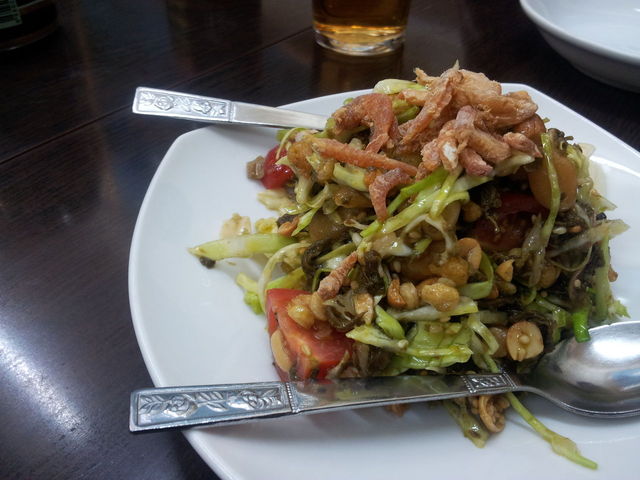 揚げた豆とお茶葉のサラダ。代表的なミャンマー料理の1つです。小エビとトマト、千切りキャベツと和えていただきます。