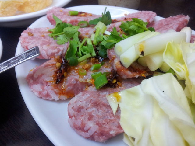 「お客さんの多くが頼む」という、お店のお父さんオススメの一品。粗めに挽いた豚肉と米をソーセージに。ちょい辛いソースとスパイス、パクチー、ネギと一緒に食べるとこれぞエスニック!酒のつまみとして抜群ですね。オススメするだけあります。