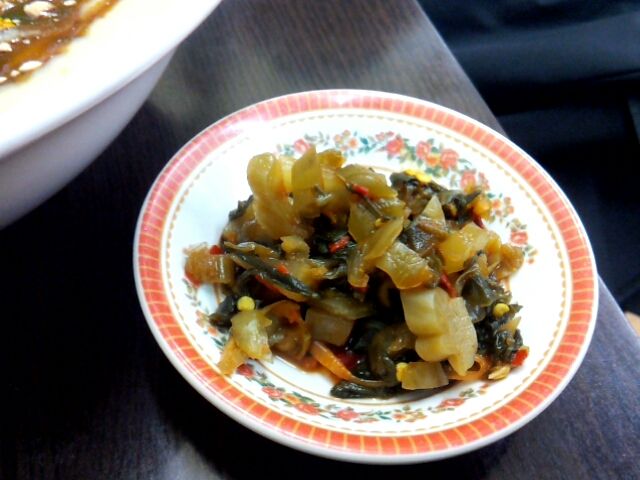 シャン族の高菜漬けモーニンチンも付いてきます。モーニンチンは日本の高菜漬けより酸味が多め。これを豆腐そばに入れて食べるのもおいしいです。