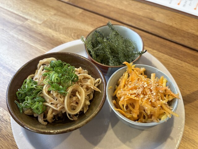 ありんくりんサラダの「ありんくりん」とは沖縄の方言で「なんでもかんでも」と言う意味。ベビーリーフに燻製サバや八朔など色々とのっている。