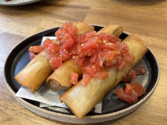 続いて島らっきょうと豚ひき肉スパイス春巻き 特製コーレグースサルサ。これもカリッと揚がっていてとても旨い。コーレグースサルサがかかったトマトはピリ辛で良いアクセント。辛さヘタレの人には結構辛かったようだ。