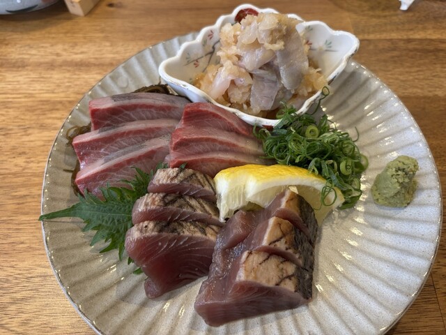 お造り三種盛りはセーイカ島とうがらし醤油、天然ブリゴマ醤油、帆立とろろ昆布。どれもひと手間かけられていて特にイカがネットリトして旨かった。