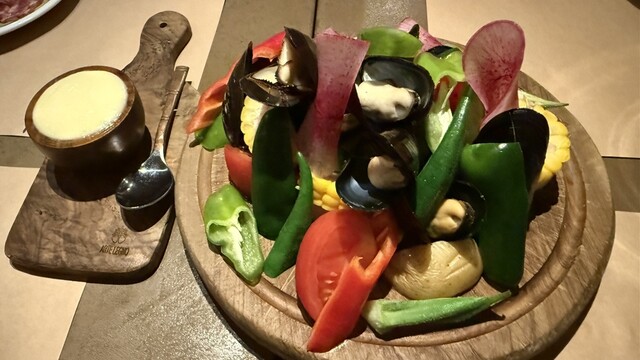 様々な種類のハムから始まり、サラダ、バーニャカウダ、トリュフ入り卵焼き、塊肉(一番わかりやすくw)、〆はパエリアと目も舌も飽きさせない波状攻撃で撃沈しました。