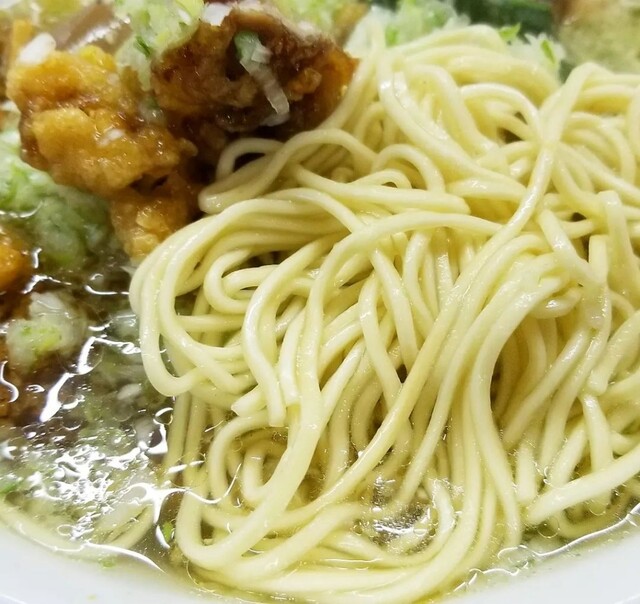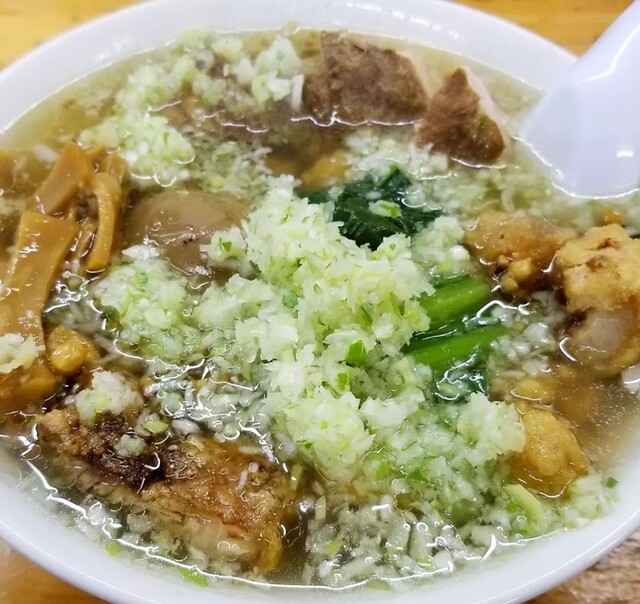 程なく到着。スープを啜ると濃いめの味付けが懐かしい。みじん切りのネギの影響かねぎタン塩みたいな味に感じます。麺は低加水の中細ストレート。具はチャーシュー/排骨/固茹で味付玉子/ネギ/メンマ/青菜。チャーシューは桂花ラーメンの太肉に近く、ホロホロ。排骨は揚げたてでサクサク。いずれも半々ながらゴロゴロ入っていて濃いめの味付けなので後半はだいぶ辛い戦いでした。年齢的にもう半々は厳しいかもしれません。次来た時は塩ラーメンの薄めで良いかもしれません。