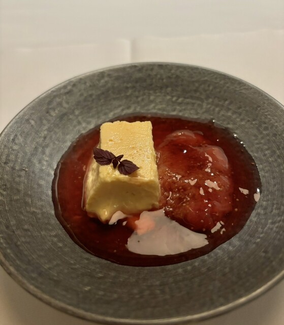 次の赤茄子・夏の海の思い出は、赤茄子のムースに、甲殻類のジュレ、雲丹、蟹がたっぷり。赤茄子の旨味と甲殻類の組み合わせがかなり美味しかったです。