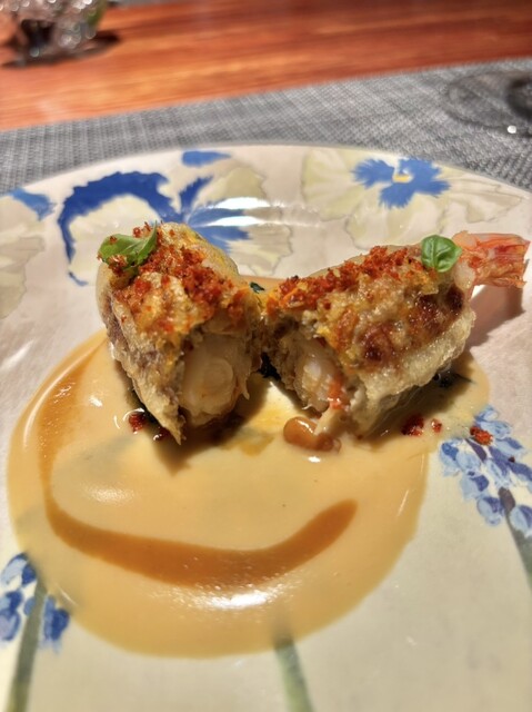 車海老と鶏のムースを花ズッキーニに詰めてフリット。ソースは瘤蜜柑と甲殻類。上に車海老の頭を乾燥したものと唐辛子。