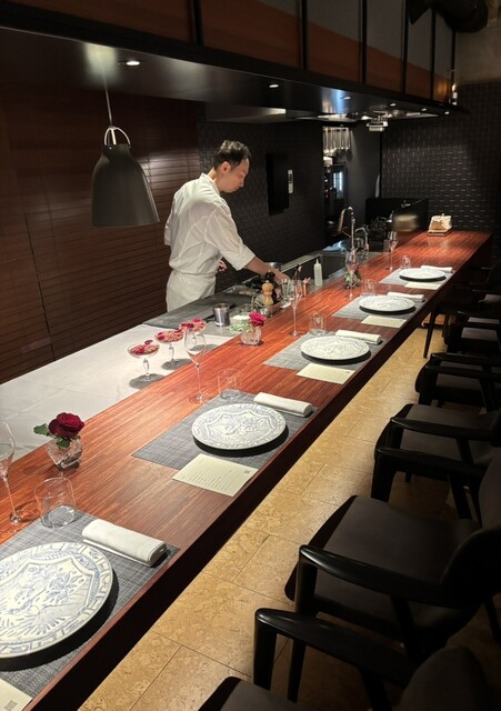 店内はカウンターとテーブル席がありますが、この縦にも横にも広いカウンターは、照明や色合い、質感なども相まってとても居心地が良かったです。もちろん優しい素敵なシェフのお仕事を間近に拝見できます。