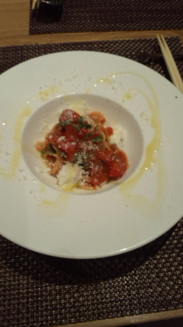 そして次がパスタ。トマトとモッツアレアチーズの冷製パスタ。