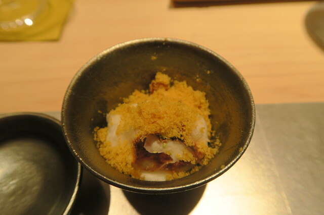 飴煮にした濃厚鮟肝には酢飯とイブリガッコフリーズドライ削りと共に。