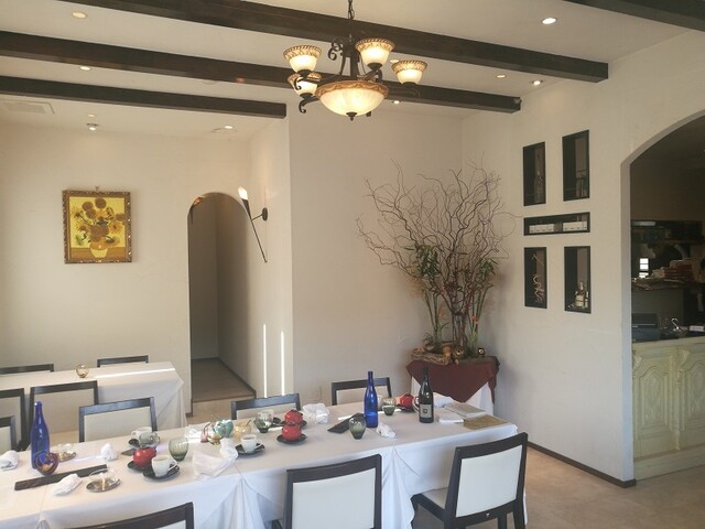 白を貴重とした店内にはゴッホのひまわりなどが飾られています。テーブルセッティングも素敵!普段はシェフおひとりでキッチンだそうですが、この日はもうひとりいらっしゃいました。ほかにフロアの方。