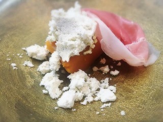 南瓜のガストロバック(ガストロバックしてからオーブンで水分を飛ばした南瓜ローズマリー風味のオリーブオイルパウダー12ヶ月熟成プロシュット・ディ・サン・ダニエーレ)