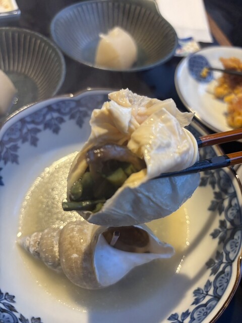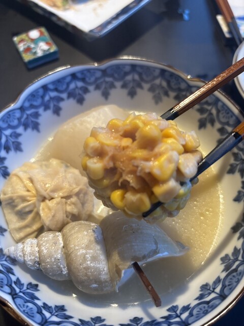 名前から気になり頼んだら中には山菜系が具沢山に!巾着って宝箱みたいだよね