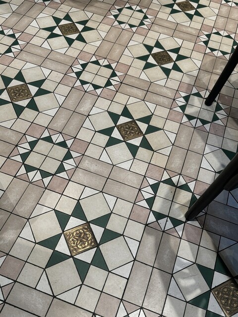 深い緑と白いタイルで満たされた空間は、照明とともに落ち着いた雰囲気。
