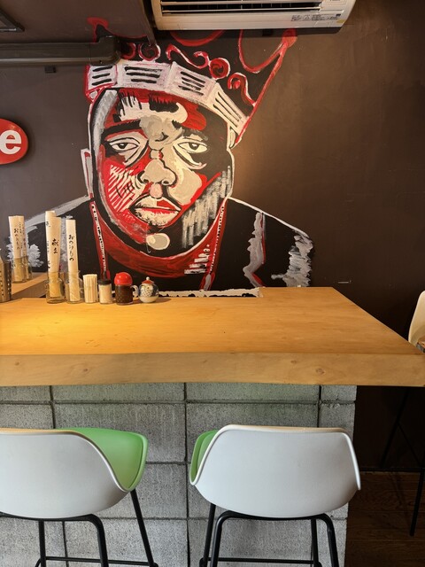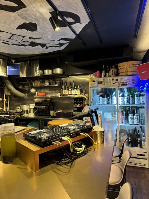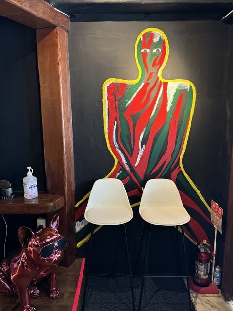真っ赤な店内の壁にはグラフィティ、カウンターにはターンテーブル。