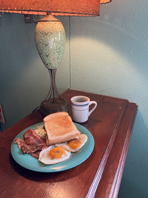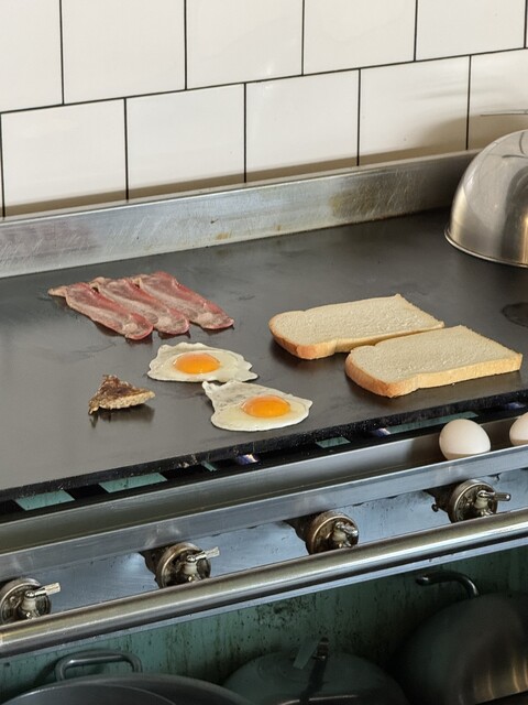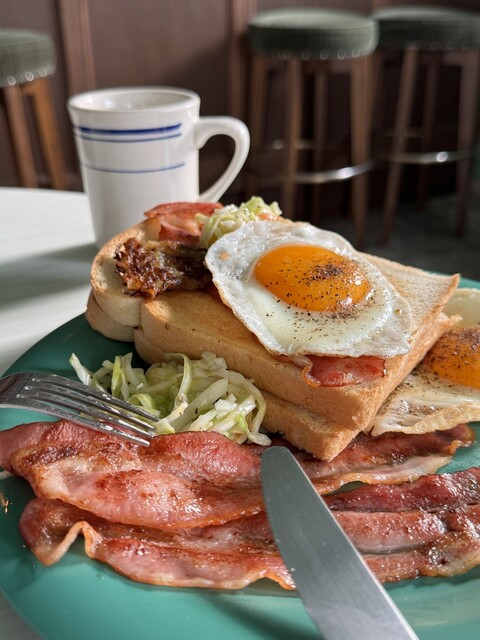 メインのプレートは玉子・ベーコン・ハッシュブラウン・コールスロー・トースト。