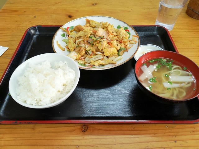 黒胡椒のパンチが効いた野菜炒めをのせた沖縄そば。