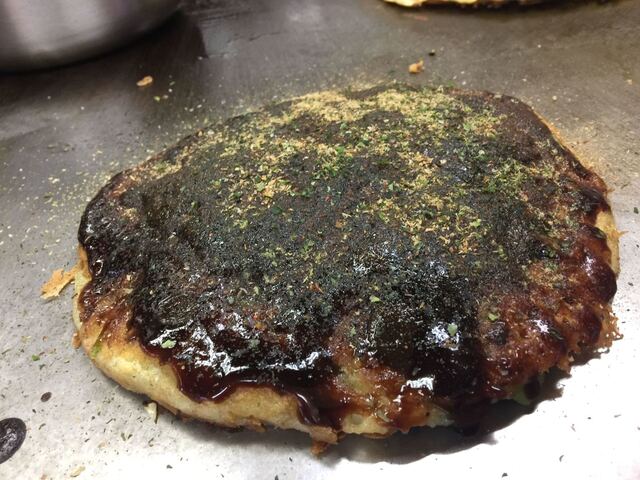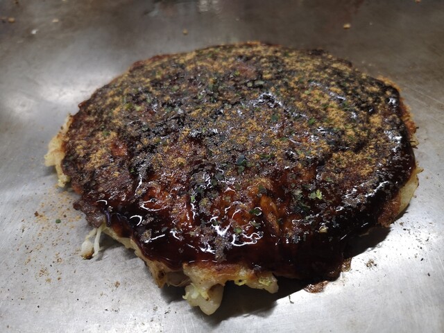 私は表面サクサク、中はふんわりというのが好きなのですが、コテでしっかり押さえつけて焼くので、かなりしっかりとした焼き加減でした。
