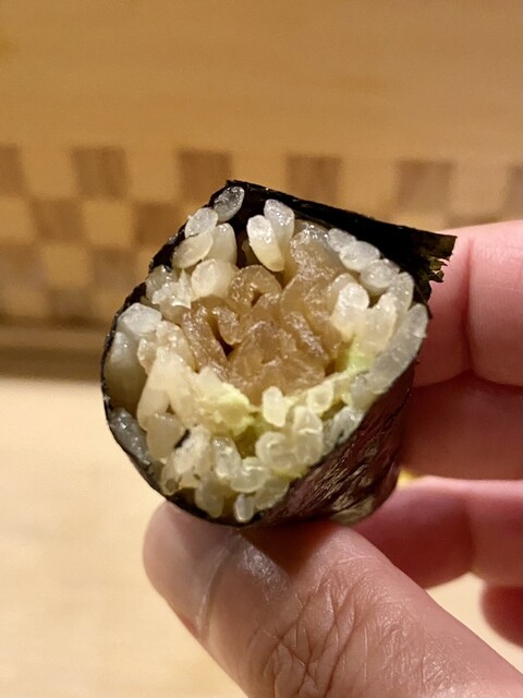 やりいかを包丁で削ぎ落として、ねっとりした食感にふわっとした空気感を持たせて口当たり。キリッとしたシャリの風味も非常に好み。