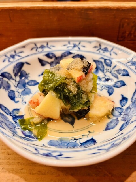 海老と柿が胡麻だれで和えられまろやかな味わい。日本酒が進む逸品。
