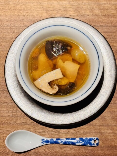真夏ではハシリとなる松茸の上湯スープ。上品な極上スープに松茸の薫りが充満しながら、シャキシャキとした松茸の食感が非常に美味しい。