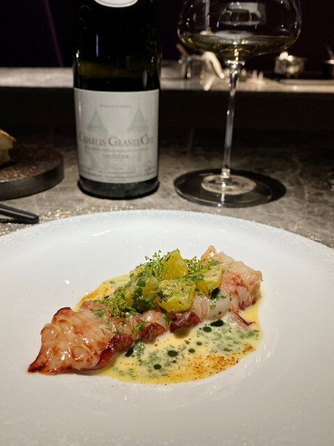 殻が青色で最高級ランクのオマール海老に、甘口ワインのソーテルヌ、パッションフルーツ、新生姜をソースに仕立て、夏みかん、ピメンデフペレット、ディルの花を添えて爽やかな味わいのオマール海老に仕立てた逸品。ぷりぷりの弾力あるオマール海老に柑橘系の味わいが意外とよく合う。