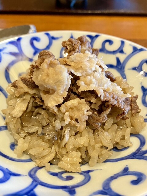 肉の丼は、熊の脂の旨味と舞茸の風味が絶妙に調和しています。ご飯には舞茸の芳醇な旨味がしっかりと染み込み、熊肉のジューシーな脂が全体に広がり、深い味わいを生み出しています。シンプルながらも、噛むたびに素材の美味しさが口いっぱいに広がり、地味ながらも忘れられない美味しさが楽しめる一品です。