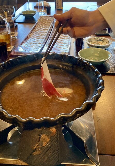 滋賀県のツキノワグマの薄切り肉。熊のロース肉とバラ肉をさっと出汁にくぐらせると、脂がとろけて極上の口当たりに。出汁には味噌を使わず、熊肉そのものの旨みを最大限に引き出した、シンプルながら奥深い味わい。