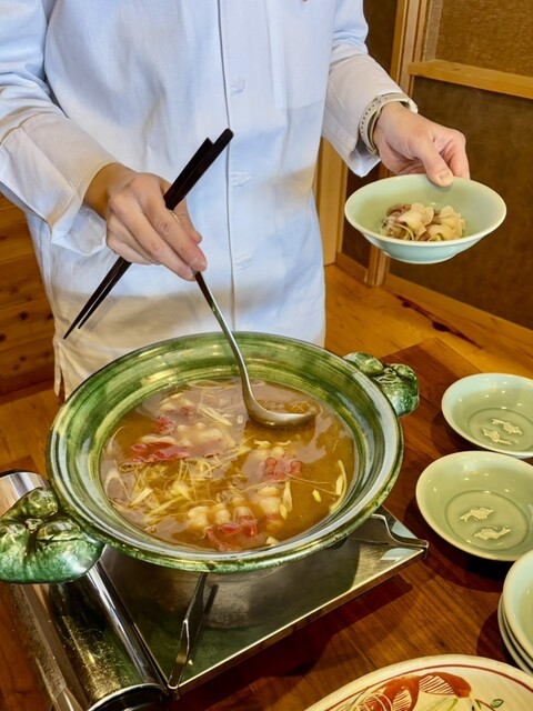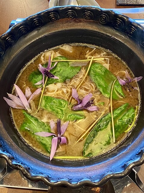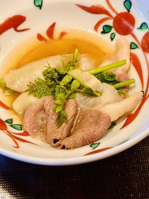 菊芋のすり流しは、滑らかな口当たりとほのかな甘みが特徴で、菊芋の自然な風味がしっかりと感じられ、わずかに土の香りが漂います。葱のシャキシャキとした食感と爽やかな香りが、猪肉とスッポンコンソメの全体のバランスを整えています。