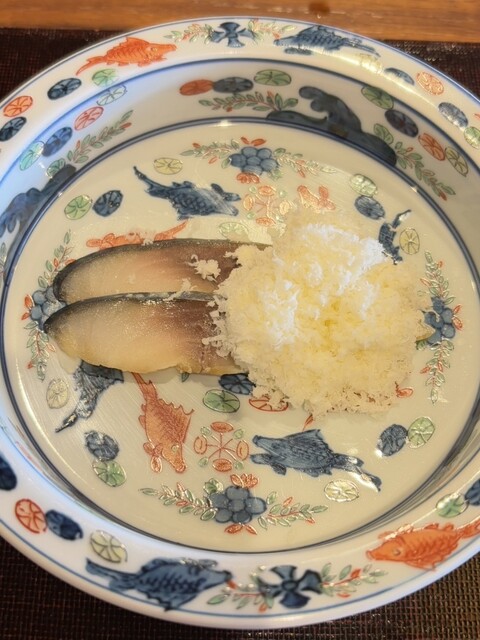 鯉の洗いに鮒の卵をまぶした料理は全く臭みを感ず、鯉の身の歯切れ良さと鮒の卵のつぶつぶ食感が豊かな湖の恵みを感じさせる一品です。繊細な風味と絶妙に調和し、口の中に広がる旨みは深く、鯉の洗いでこんなに美味しいのは初体験。