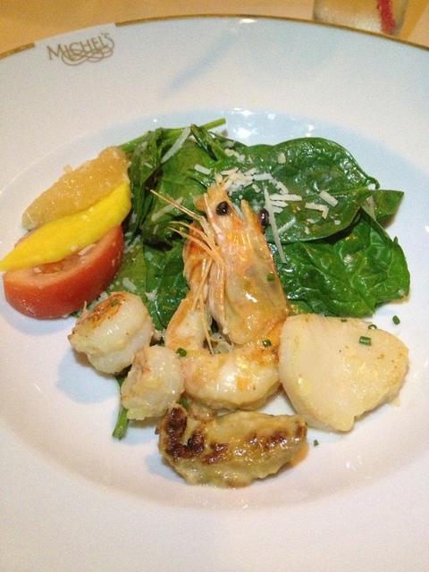 直訳すると「温かい海鮮物とホウレン草いのサラダ」であります。ハワイ産のベビーアバロニ(あわび)、ホタテの貝柱、エビ、ロックロブスターはグリルし、トマト、グレープフルーツ、マンゴー、ホウレン草は生でいただきます。様々な素材をきれいに並べて、上からパルミジャーノレッジャーノと、レモン・ライムドレッシングをかけてあります。少しずつ混ぜていただきましたが、シンプルで素材を活かしながらも、フルーツとシーフードの取り合わせが抜群ですね。