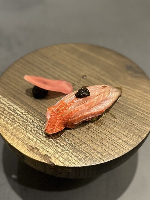 ⑱杉寿司 TYPE-S(鰹魚醤でGVした勝浦産釣りキンメ2kg弱サイズ、うに、トリュフ風味の卵黄、新政亜麻猫の酒粕和え茗荷ピクルス)