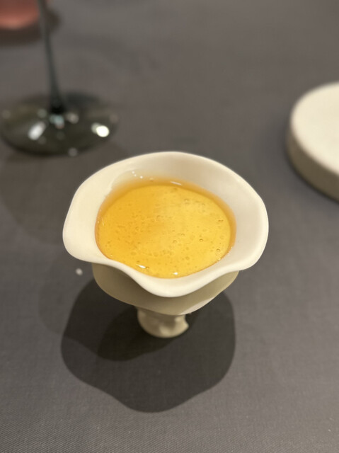 鯛のアラで取った出汁をワイングラスで香りを楽しみながらいただきます。