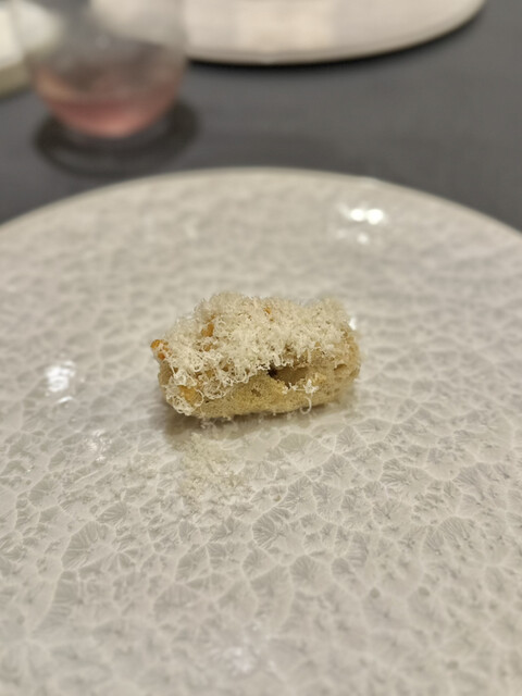 ➈ 鱧(ヤマドリタケと鱧の骨スープでGVした鱧のフリット、擂ったマカダミアナッツ)