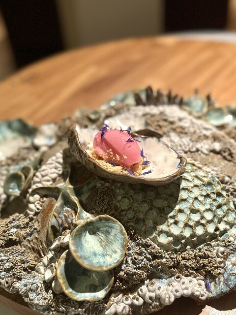 地元の海産物にこだわり、次々と繰り出される数々のシーフード料理。シェフは地元の猟師さんと直接つながっており、時には一緒に漁に出るなど精力的に活動されているとの事です。アミューズが全てシーフード!!この旅行中に食べて来たお店のアプローチとは全く異なる角度からのアプローチに新しさを感じましたね。特に地元ゼーランド産の焼き牡蠣は注文して良かったですね~。日本の様に醤油をチョロっとかけただけではありません。独特な風味のホワイトソースの上には食べた事が無い新食感の海草2種類とキャビア。焼き牡蠣ってとても美味しいんですけど、塩味と旨みの2点だけ強烈で、甘味と酸味が足りないと常々思っていたんです。こちらではそれが補完されてバランスの良い味に整えられていました。手長海老のブランチャは凄い素材力ですね。こんなカニの様な殻を持つデカい手長海老もいるんですね。スパイシークリームに旨みを蓄えてメチャクチャ濃厚です。メインのフォアグラ2皿は、、、残念すぎる!写真を撮り忘れてしまいました。いや、シーフードではないですけど、火入れの良さと素材の良さが重なり、思わず目が真ん丸になるくらい美味しかったですよ。やっぱりシェフは凄腕ですね。胃袋の小ささに悔しい思いをしながらデザートはスルーしました(涙) 小菓子はワゴンサービスらしいので注文してみると、絶対に全部食べられないほどの量。しかもチョコレートの質も高いですね~。ここも素晴らしかった。というか記憶にしっかりと残る個性的なレストランですよ。