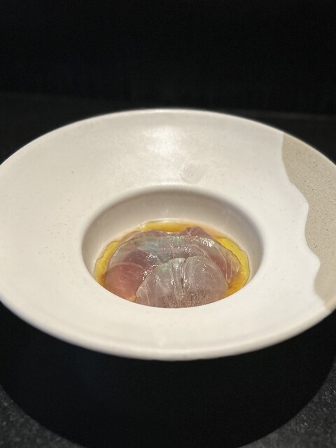 ⑫バラマンディ(インド洋の白身魚)、ビリンビ(熱帯雨林の酸味が強い果実)、ジンジャーフラワー(生姜の花)、レモングラスと魚の出汁ソース