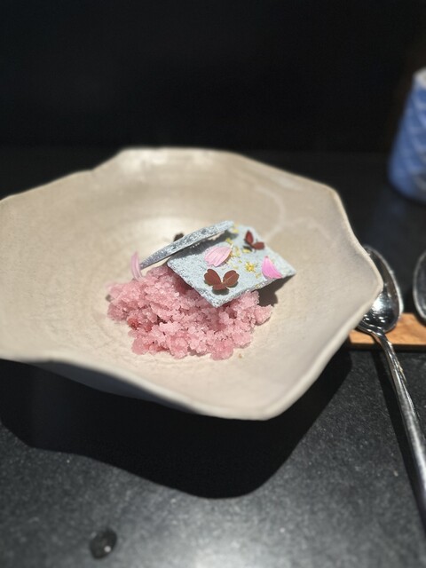 ⑭バタフライピー(青い花)のメレンゲクッキー、干した桑の実のグラニテ、メロンソルベ