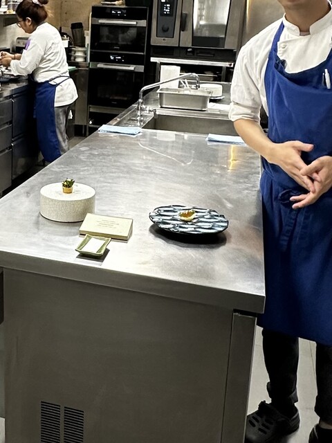 その後キッチンへ案内されまして、待ち受けていた調理担当の方から「②シーフードゼリーのココナッツタルト」と「③ネームロンのクリスピーカップ」の二皿を立ち喰いさせていただきました。