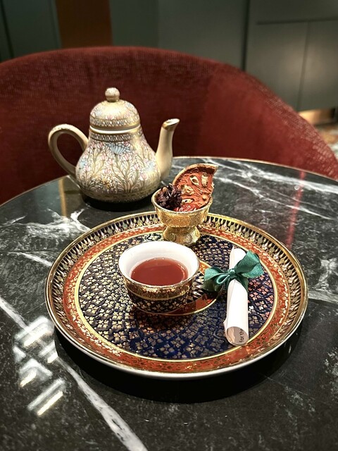 まず入店すると1階のソファーで、ベンジャロン焼きの美しいティーセットでウェルカムドリンクのホットタイティ―をいただきます。