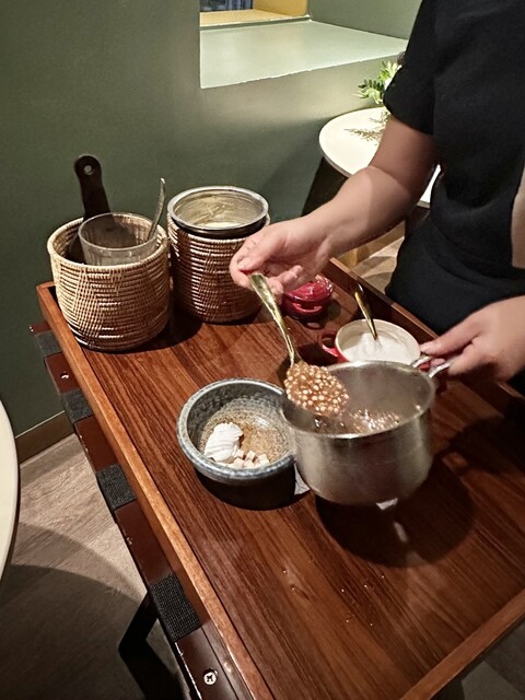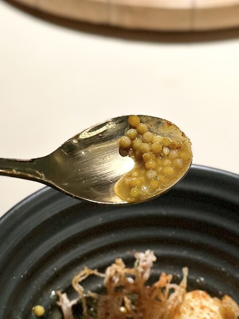 凄い少量多品種ですね。一つ一つ説明してはきりがないので、かいつまんで申し上げます。まず驚きの食材「カブトガニの卵」これは人生初ですね。日本では天然記念物に指定されているので食べる事はできませんが、タイでもレア食材であるものの、まだまだ食べる事ができます。味はどうでしょう。プチプチした食感が印象的です。グラミーフィッシュも人生初ですね。熱帯魚としても流通している鱗が鮮やかな淡水魚。白身魚として美味しいと思いました。グリーンカレーは香草スパイスが、ゴリゴリと手で挽いた完全手作りで、フレッシュココナッツミルクを使っているので超絶美味い♪ これも日本では食べられませんね~。見た目だけでは味の想像がつかない料理が多く、もう終わりかと思うとまだ終わらない。最後のデザートと小菓子もこれでもかというこだわりの連発です。凄い期待感と満足感。イノベーティブのレベルも高いのに味も安定しています。ここは大満足!!今のところ今回の旅でナンバーワンですよ。次にバンコクに行った時にもぜひ再訪したいとおもいます。