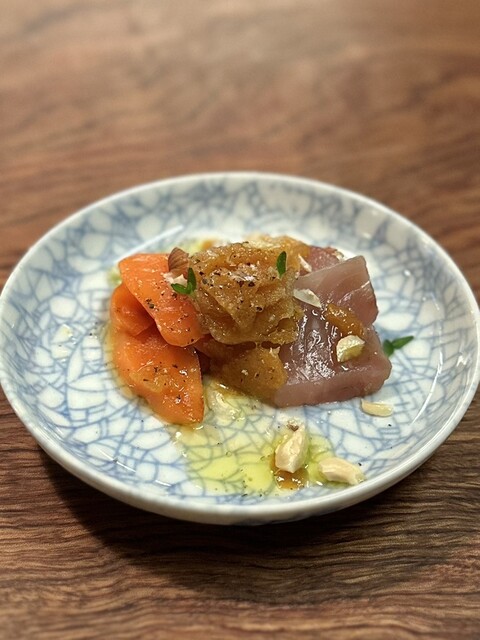 ①ビンチョウマグロとサーモンのカルパッチョ 千葉県産フルーツトマトエキスのシャーベット シラクーサのオリーブオイル