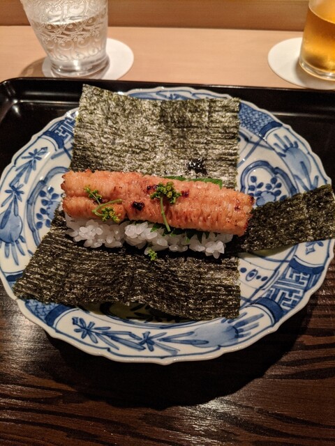 続く穴子の手巻き寿司は、ふわりと柔らかく煮上げられた穴子と、艶やかな酢飯、そしてパリッとした海苔の香ばしさが三位一体となった、贅沢な一口。これだけで杯を進めたくなります。