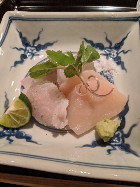 お造りは、炙り穴子、平貝、スズキ。穴子は炙ることで香りと旨味が際立ち、平貝は歯ごたえと甘みが印象的。スズキは弾力と透明感のある味わいで、いずれも新鮮さが際立ちます。