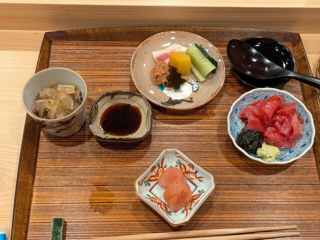 数の子、玉子焼き、バチコ、蒸し鮑、いくらの醤油漬け、黒豆、菜の花のおひたし、味こんにゃく、炊いた昆布など手間のかかる一品が並びます。品数が多く、季節感を感じる盛り合わせです。どれもお酒に合う味付けで、お酒が進みます。